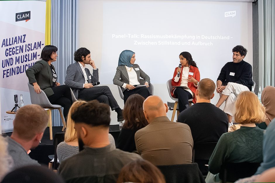 Die zweite Podiumsdiskussion fokussierte sich konkreter auf das Themenfeld des antimuslimischen Rassismus in Deutschland. Es diskutieren Reem Alabali-Radovan, Aliyeh Yegane Arani (Leitung unabhängige Anlaufstelle für Diskriminierungsschutz an Schulen, ADAS/Life e.V.), Amir Alexander Fahim (Türkische Gemeinde Deutschland) und Rima Hanano (CLAIM) über die aktuelle politische Lage und Strategien im Hinblick auf antimuslimischen Rassismus und Islam- und Muslimfeindlichkeit. Die breite Anerkennung des Phänomens sei eine große Herausforderung, aber auch die Voraussetzung für politisches Handeln zur Bekämpfung von antimuslimischem Rassismus, so Rima Hanano. Ebenfalls diskutiert wurden konkrete Auswirkungen für Betroffene von antimuslimischem Rassismus und der fehlende Zugang von zivilgesellschaftlichen Selbstorganisationen zur Politik.