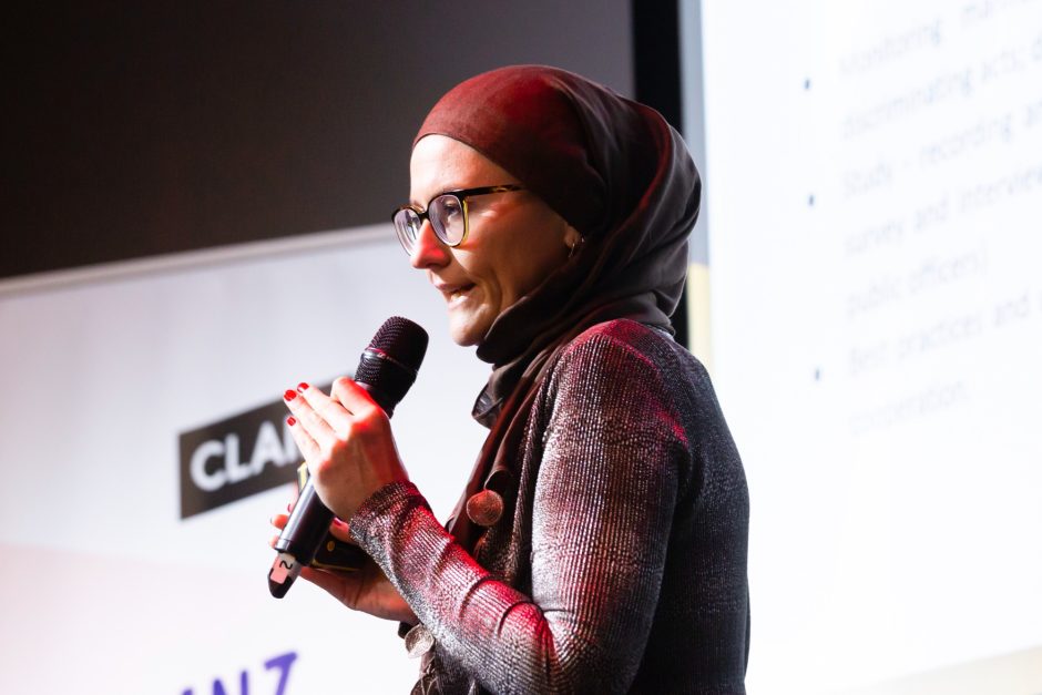 Den Tagesabschluss bildete das letzte Panel mit Dr. Sanja Bilić (European Forum of Muslim Women), Sabrina Saoudi (OSZE, ODHIR Beraterin zur Bekämpfung von Intoleranz und Diskriminierung gegenüber Muslim*innen), Sabrina Wulff (Algorithm Watch) und Nevena Peneva (European Fundamental Rights Agency), moderiert von Elisabeth Walser (CLAIM, Leitung Community-basiertes Monitoring). Die Panelist*innen tauschten sich darüber aus, wie die Unterstützung von Betroffenen von Rassismus und die Erfassung von Daten zu Diskriminierung durch multisektorale Kooperationen verbessert werden können. Sie hoben dabei die Chancen und Herausforderungen solcher Kooperationen hervor.