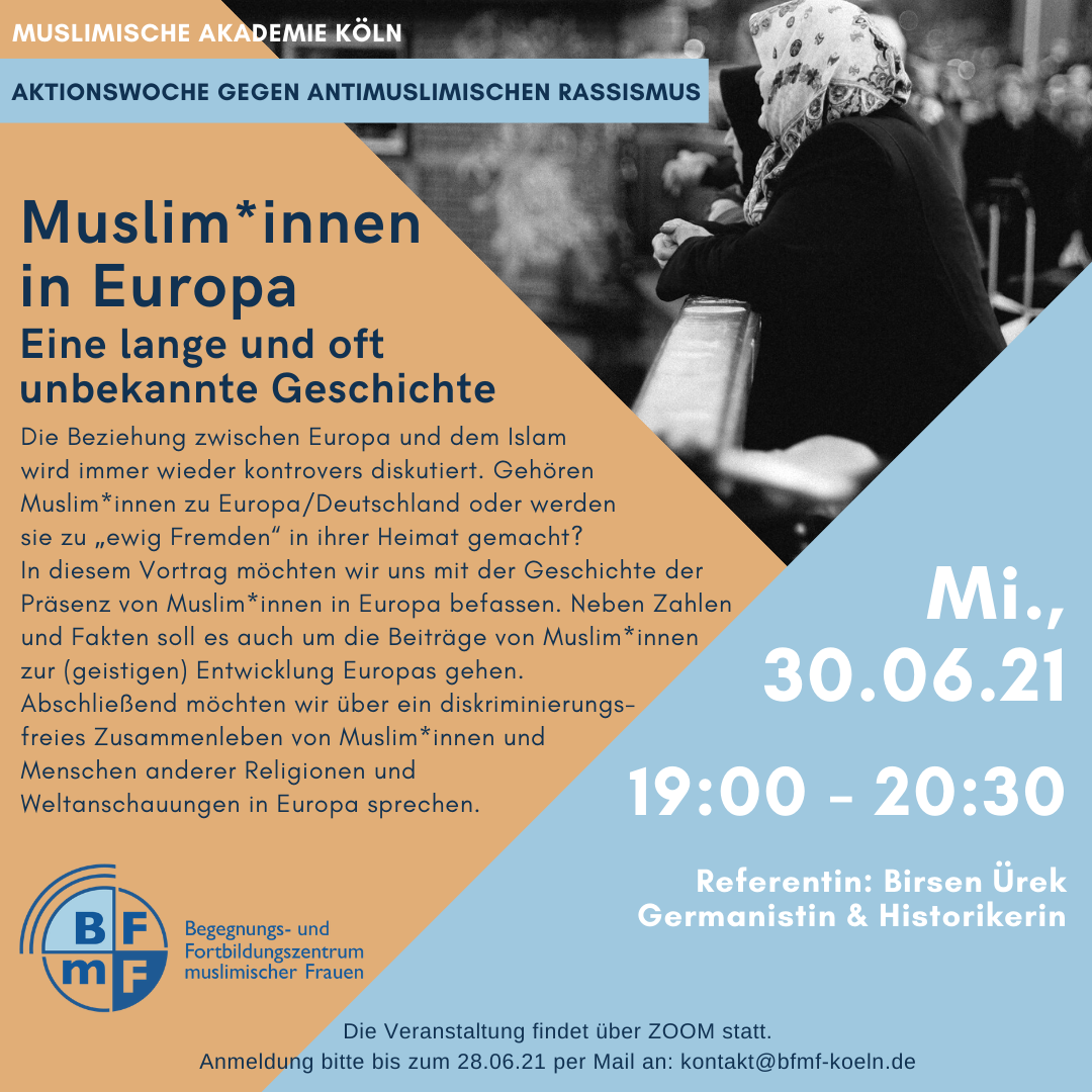 In diesem Vortrag möchten wir uns mit der Geschichte der Präsenz von Muslim*innen in Europa befassen. Neben Zahlen und Fakten soll es auch um die Beiträge von Muslim*innen zur (geistigen) Entwicklung Europas gehen. Abschließend möchten wir über ein diskriminierungsfreies Zusammenleben von Muslim*innen und Menschen anderer Religionen und Weltanschauungen in Europa sprechen.