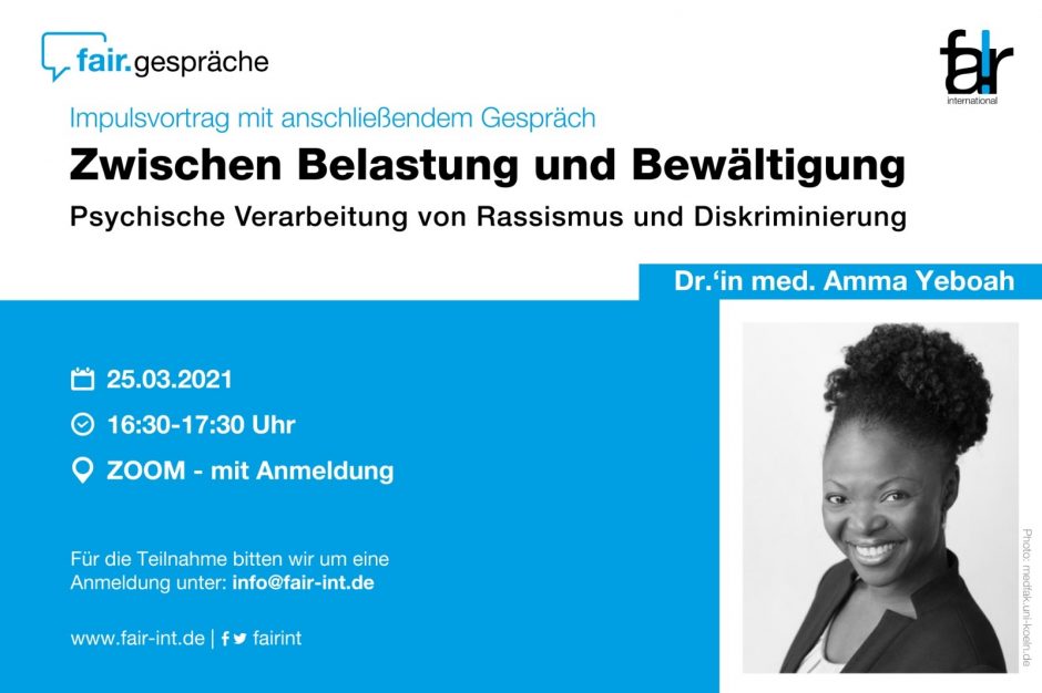 Online-Impulsvortrag „Zwischen Belastung und Bewältigung – Psychische Verarbeitung von Rassismus und Diskriminierung“ mit Frau Dr.in med. Amma Yeboah am 25.03.2021 von 16:30 bis 17:30 Uhr über Zoom.